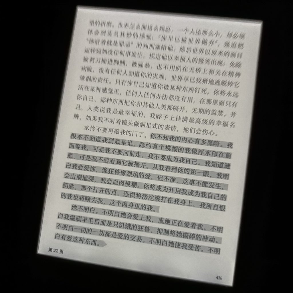 距今已有六年之久,改善並不算大,偶爾我仍在體會剝開肌膚的那種釋放感。在度過這近乎人生三分之一的時間後,我對一切的起點早已模糊,是家境、學業、還是母親?我不再會知曉了。曾有很多人問我這究竟是一種怎樣的感覺,但一直無法找到合適的形容,現在我知道了:這是一種身體無法承負個體靈魂的悲哀。當一個人真正意識到自我與他人的不同時就會陷入這種困頓——我仍未從這種困頓中脫離出來,於是慢慢地轉變為一種身體的記憶,或是習慣。